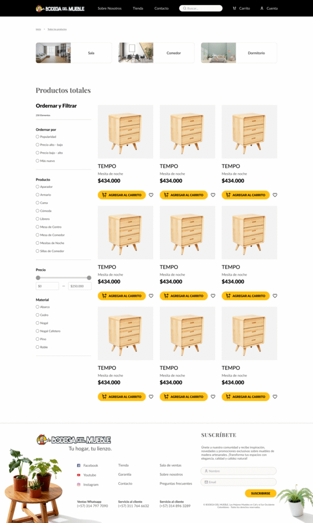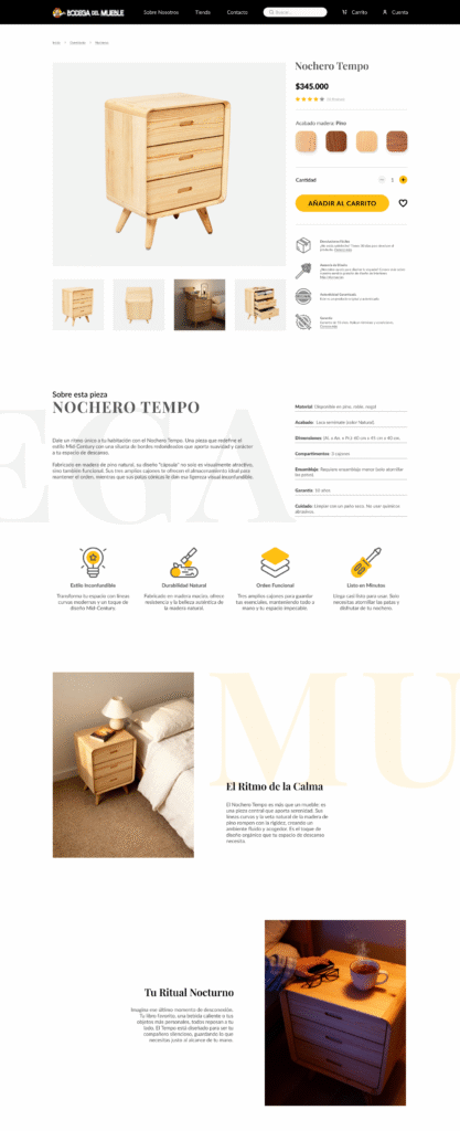 To solve the “poor navigation,” I designed and implemented a shop page with a clear and powerful filtering system (price, material, style), allowing the user to find exactly what they are looking for.